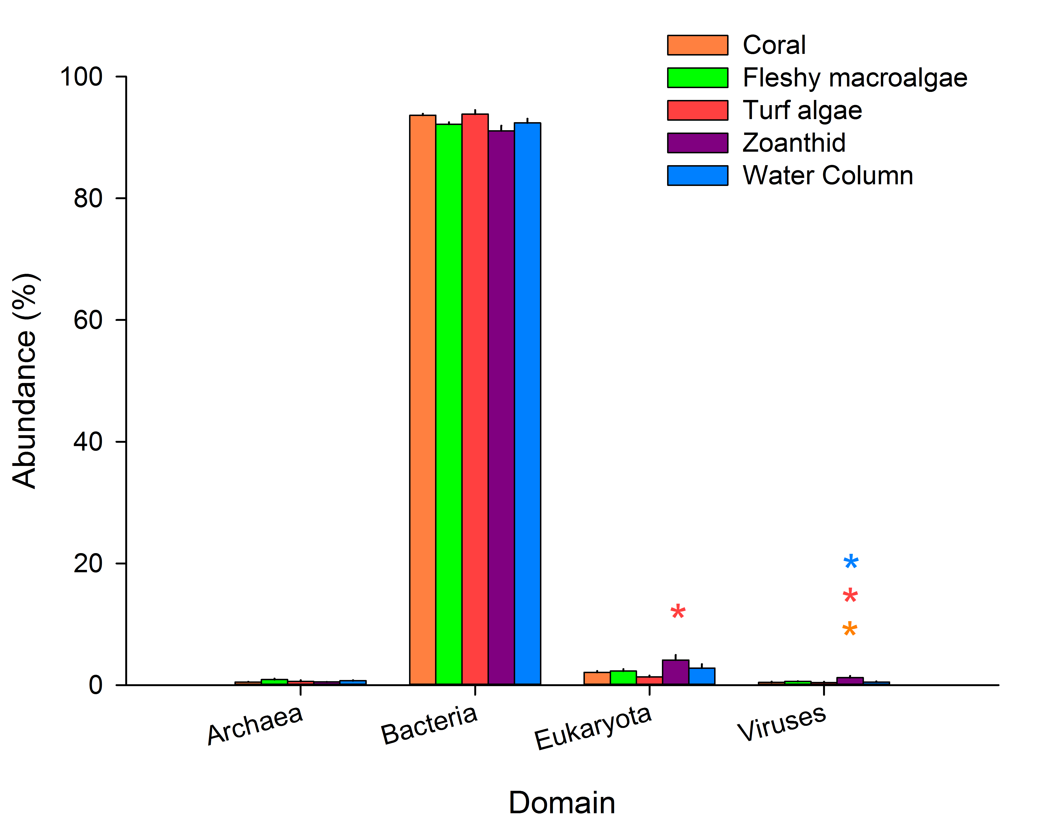 The average abundances of sequences at the domain level were compared between macro-organism aura-biomes. Asterisks above a domain designate a significance difference, while color delineates which samples varied.