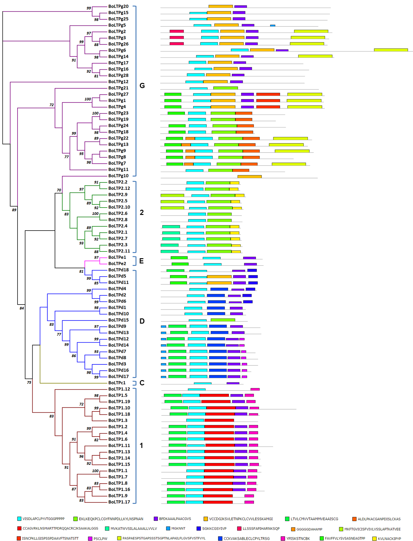 The plant nsLTPs can be divided into four major and several minor types according to intron position, sequence identity and spacing between the Cys residues in the 8CM, as well as the post-translational modifications (Edstam et al., 2011; Salminen, Blomqvist & Edqvist, 2016). Based on the presence of a GPI modification site, the classification was initiated by first sorting the identified BoLTPs into Type G. In the second round of classification, the remaining BoLTPs were sorted based on the identity matrix calculated from the multiple sequence alignments. When compared with the classification proposed by Edstam et al. (2011) and Salminen, Blomqvist & Edqvist (2016), we found that 80 out of the 89 BoLTPs could be categorized into six types (1, 2, C, D, E and G). Type1, type2, type D and type G nsLTPs, which encompassed 19, 12, 18 and 28 nsLTP genes, respectively, clearly represented a large proportion of the BoLTPs. Moreover, nine cabbage proteins displayed less than 30% identity with all other studied BoLTPs, so they were listed individually and named BoLTP×1 to BoLTP×9 (Table 1).