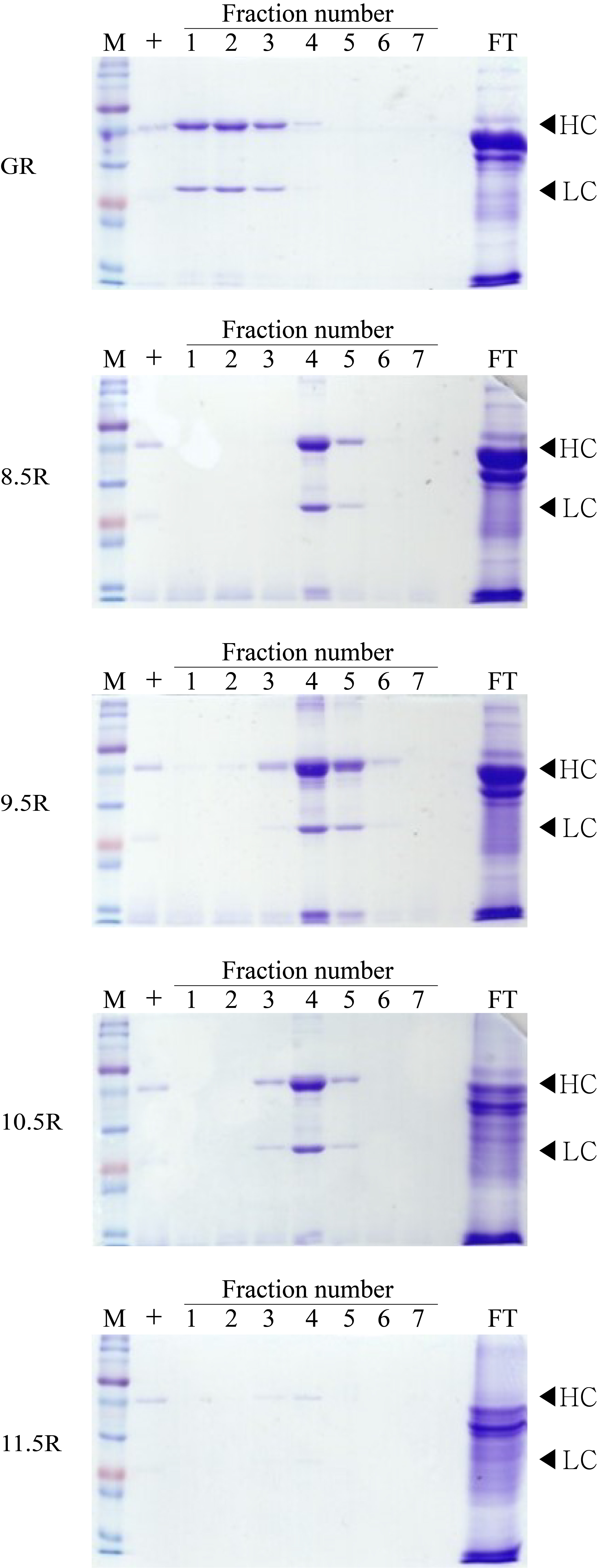 Lane 1, protein marker; Lane 2, positive control (+), human rabies immunoglobulin (HRIG); Lane 3–9, eluted fractions of the purification F1–F7, respectively; Lane 11, flow through; HC, heavy chain of mAbP; LC, light chain of mAbP. Epoxy-activated agarose beads were coupled to protein A under the pH conditions of 8.5, 9.5, 10.5, and 11.5 (8.5R, 9.5R, 10.5R, and 11.5R, respectively). Commercial protein A resin (GR) (GE Healthcare, Uppsala, Sweden) was used as a positive control.