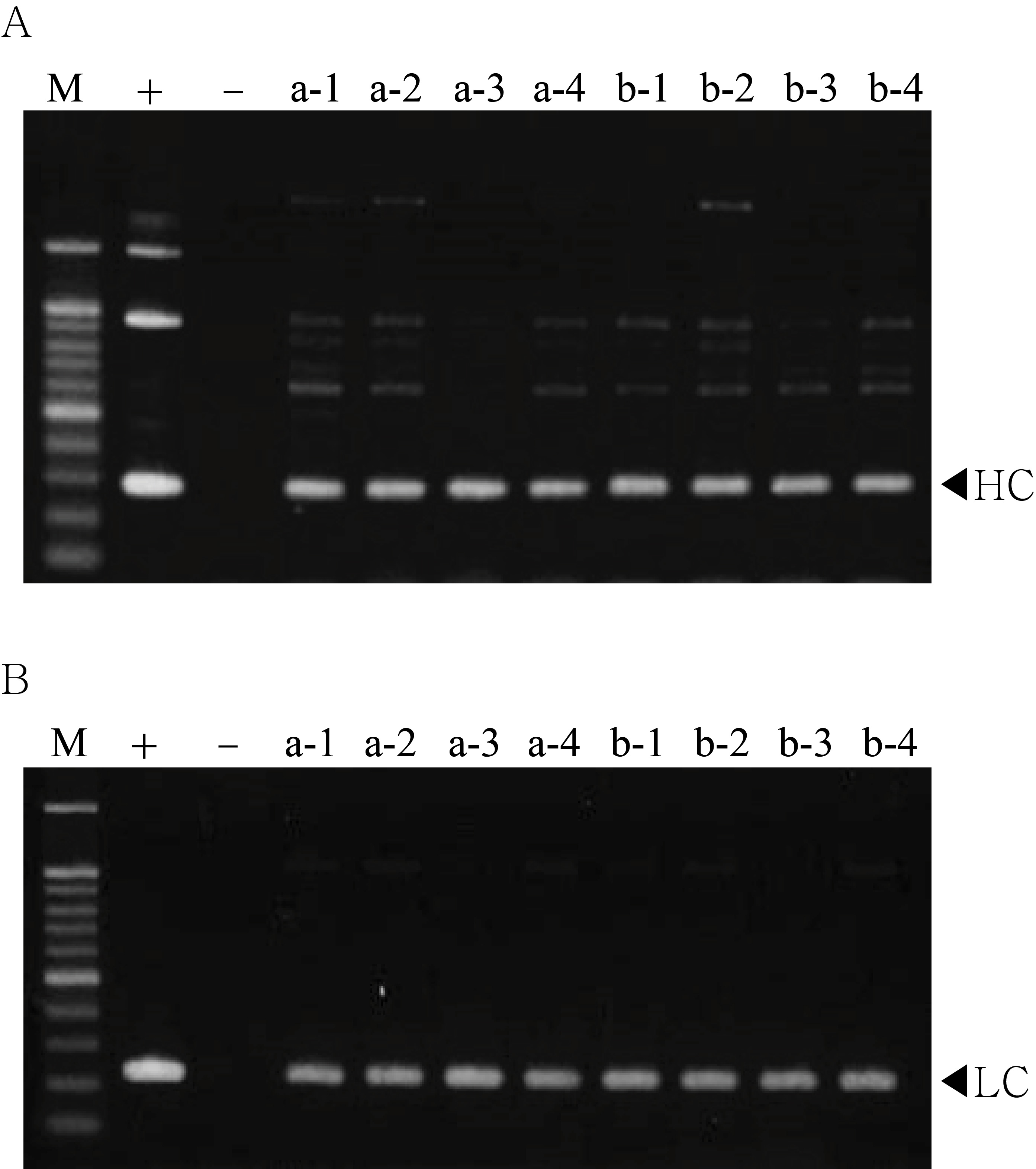 PCR analysis of T1 generation plants to confirm heavy chain (HC) and light chain (LC) gene existence and expression level.