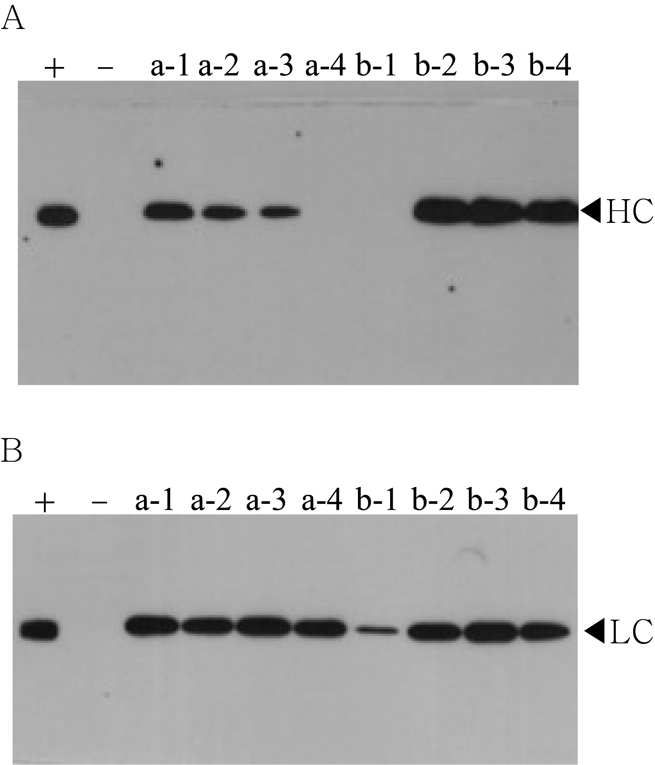 Western blot analysis of T1 generation plants to confirm heavy chain (HC) and light chain (LC) gene existence and expression level.