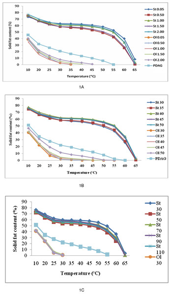 Figure 1A shows the SFC of PDAG fat and its fractions at different cooling rates. The olein fractions curves showed lower SFC compared to PDAG fat. It was observed that olein fractionated at lower cooling rates of 0.05, 0.5 and 1.0°C/min were completely melted at lower temperature (40°C) whereas, the SFC for olein fractionated at 1.5 and 2.0°C/min still retained at 0.97% and 3.1%, respectively. At cooling rate of 2.0°C/min, the SFC of olein fraction was highest due to high content of SAFA and low amount of unsaturated fatty acids. As crystallisation temperature decreased, the SFC for the olein fractions decreased. Ol 30 and Ol 35 completely melted at body temperatures whereas, the solid fat of Ol 40, Ol 45 and Ol 50 still retain at 2.42, 2.82 and 8.32%, respectively (Fig. 1B). Agitation speed does not affect the SFC of the olein fractions (Fig. 1C). The SFC of stearin fractions (Figs. 1A–1C) are all higher than the SFC of palm-based DAG fat and were melted at temperatures above 65°C. This is due to the fact that the stearin fractions contained higher amounts of saturated fat with high melting points and were crystallized out at higher temperatures during the fractionation process. One can observed that the SFC of stearin fractions is not influenced by these three parameters.