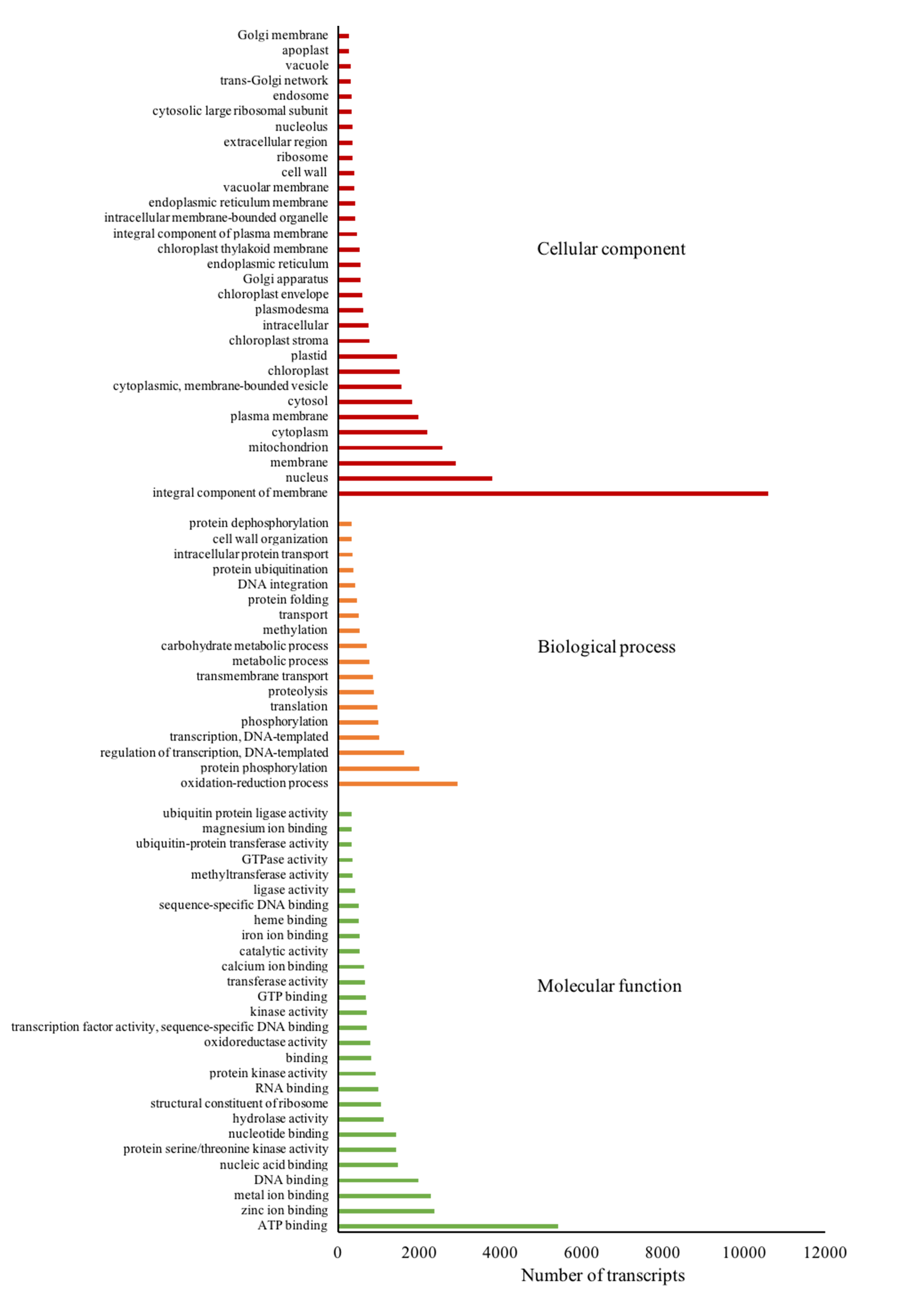 Three groups of GO terms are presented including Cellular component (red bars), biological process (orange bars) and Molecular function (green bars).