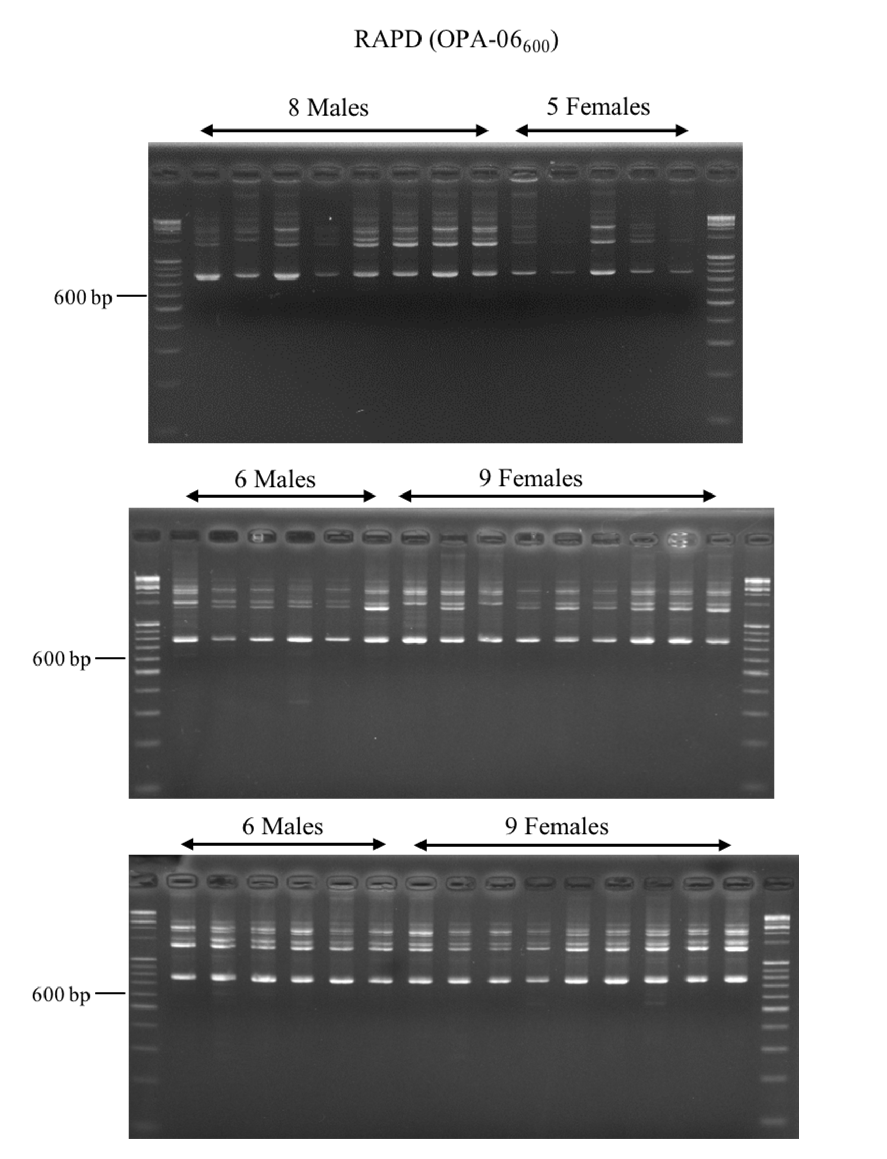 PCR analysis of 20 male and 23 female Asian Palmyra palm samples using OPA-06600 RAPD marker