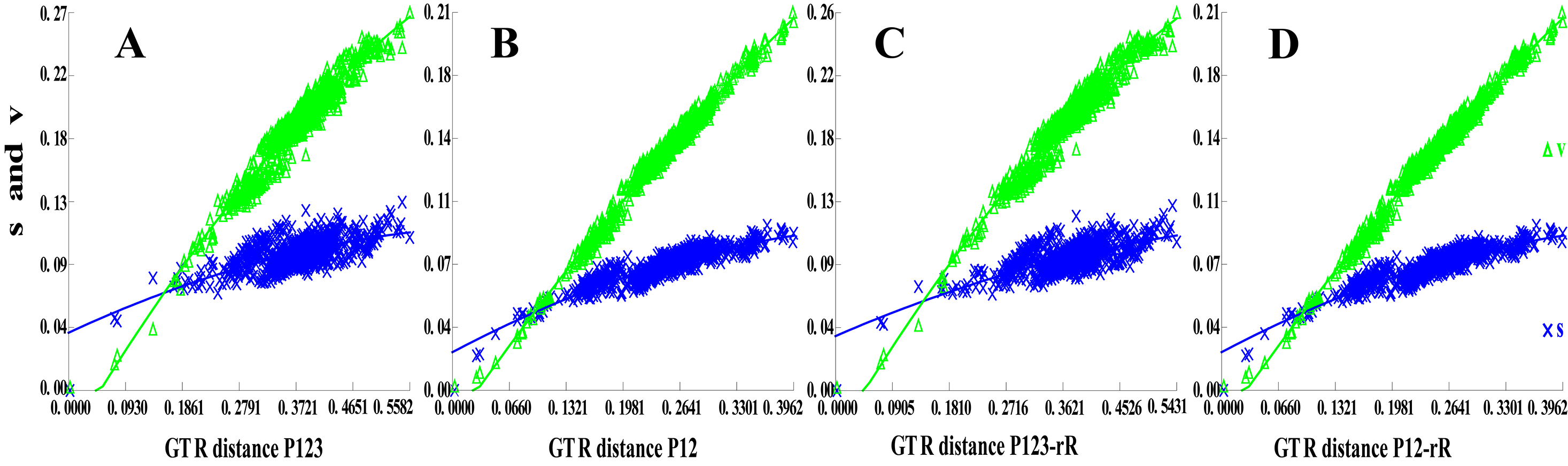 Phylogenetic trees were constructed on the basis of five concatenated nucleotide sequence datasets from 40 available mitogenomes of Membracoidea, with two species considered outgroups [Cicadoidea (T. auropilosa) and Cercopoidea (C. bispecularis)]. Saturation analysis addresses the issue on whether some positions or partitions of a dataset are saturated and to test whether these sites can be used for further phylogenetic analysis. These phylogenetic trees showed uncorrected pairwise divergence in transitions (s) and transversions (v) against divergences calculated with the GTR model, and none of the four candidate nucleotide sequence datasets (Fig. S1A: P123; Fig. S1B: P12; Fig. S1C: P123-rR; Fig. S1D: P12-rR) had reached saturation (all Iss <Iss. cSym or Iss. cAsym, p = 0.0000) (Table 4; Fig. S1), thereby suggesting that the concatenated data is suitable for phylogenetic analysis.