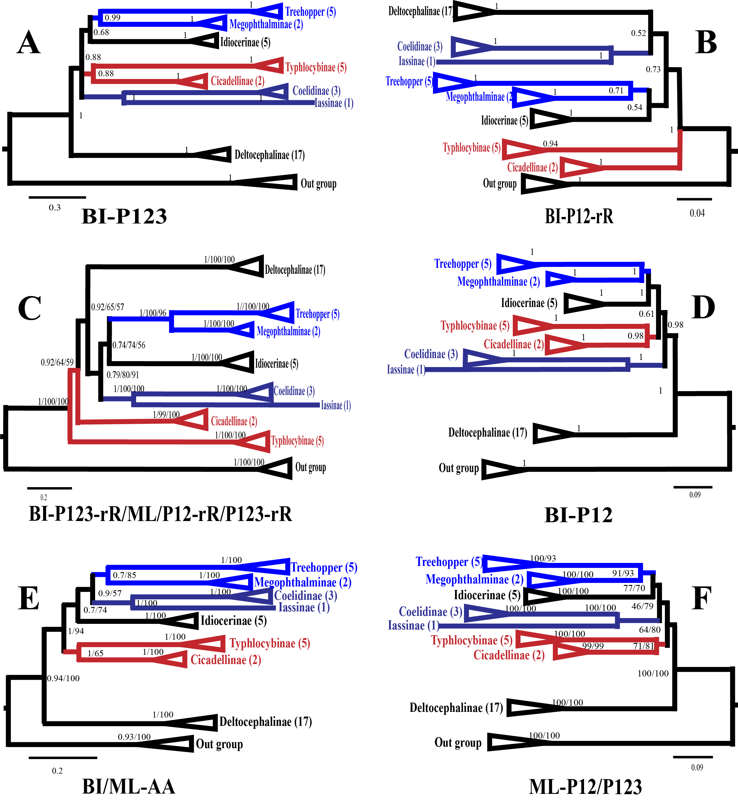 The phylogenetic relationships inferred according to the five datasets showed slightly different topologies. In the BI-P123-rR/ML-P12-rR/ML-P123-rR analysis, the main topology was as follows: (Typhlocybinae + (Cicadellinae + (Deltocephalinae + ((Coelidiinae + Iassinae) + (Idiocerinae + (Treehopper + Megophthalminae)))))) (Fig. S2C). This topology is consistent with that reported in a previous study (Du et al., 2017) based on BI analysis of amino acid sequences. However, in some other studies (Du et al., 2017; Wang et al., 2018), the main topology has been reported to be different, i.e., (Deltocephalinae + (Typhlocybinae + (Cicadellinae + ((Coelidiinae + Iassinae) + (Idiocerinae + (Treehopper + Megophthalminae)))))) (Fig. S2D). This difference can be mainly attributed to the unstable positions of Deltocephalinae, Typhlocybinae, and Coelidiinae and Iassinae (Fig. 7).