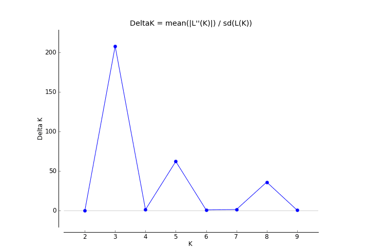 When K=3, the value of delat K is the largest and best fit three genetic groups. When K=5, the value of delat K is also large, so we analyze the cases of K=3 and K=5.