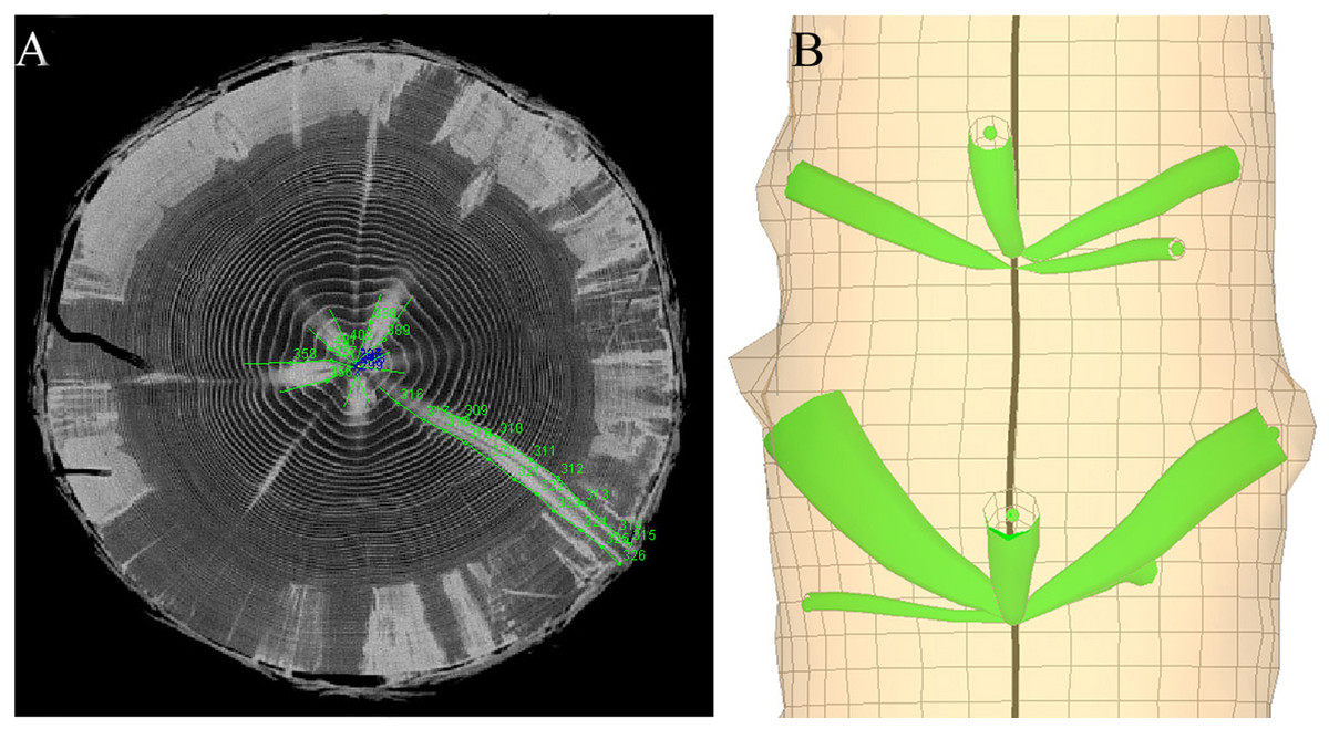 (A) Extraction of the position and diameter of each knot profile on CT scanning images using the ImageJ Java plug-in ‘Gourmand’ and (B) reconstruction of the 3D geometry of each knot using the software “Bil3D.”The demarcation between stem and knot xylem cannot be considered as perfectly discrete. Knot profiles were therefore extracted from the CT images by manually delineating high density wood corresponding to a knot and the surrounding lower density stem wood. Although the transition was generally clear enough to ensure accuracy (Fig. 1), the knot reconstruction process produced some localized irregularities that did not reflect the true shape of the knots. For this reason, we chose to smooth the radial profiles of each knot using a combination of two Weibull equations, which can reproduce a wide variety of knot profiles (Duchateau et al., 2013a). This also had for advantage to provide a parametric description of each knot that was dependent on the radial position within the stem. It is possible, however, that abrupt variations in knot shape were missed due to the smoothing process.