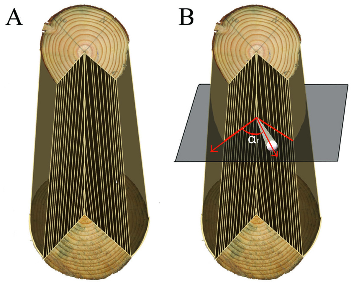 (A) Interpolation of the rings between the two discs to reconstruct the log and (B) selection of the two cardinal directions bordering the knot to reconstruct the ring widths along the knot profile.To obtain estimates of stem growth in the azimuthal direction of a knot (Fig. 2B), a second interpolation was made from the two surrounding cardinal directions for which we had annual ring width measurements. In this case we used a weighted average of the two known ring width series located on each side of the knot. We defined αr as the azimuth angle between a knot and one of the two cardinal directions on each side. The weighting factor was calculated as (90-αr)/90, which approached a value of 1 if the knot orientation was close to one of the two cardinal directions. Due to irregularities in stem shape, the resulting series of stem rings associated with a given knot did not end in the same exact location as the knot-stem interface, which was located on the CT images. Therefore, a small correction constant was added (or subtracted) to each ring in the series to ensure that both matched exactly. These linear interpolations of annual ring width variation between two sample discs were a simplification, since in reality growth rings deviate around knots (Pellicane & Franco, 1994). However, given the imposibility to extract the position of growth rings along each knot directly from CT images, this was considered as a good approximation.