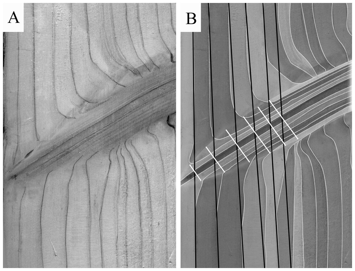 (A) Example of ring width deformations around a knot; (B) extraction of the annual knot data.Model development