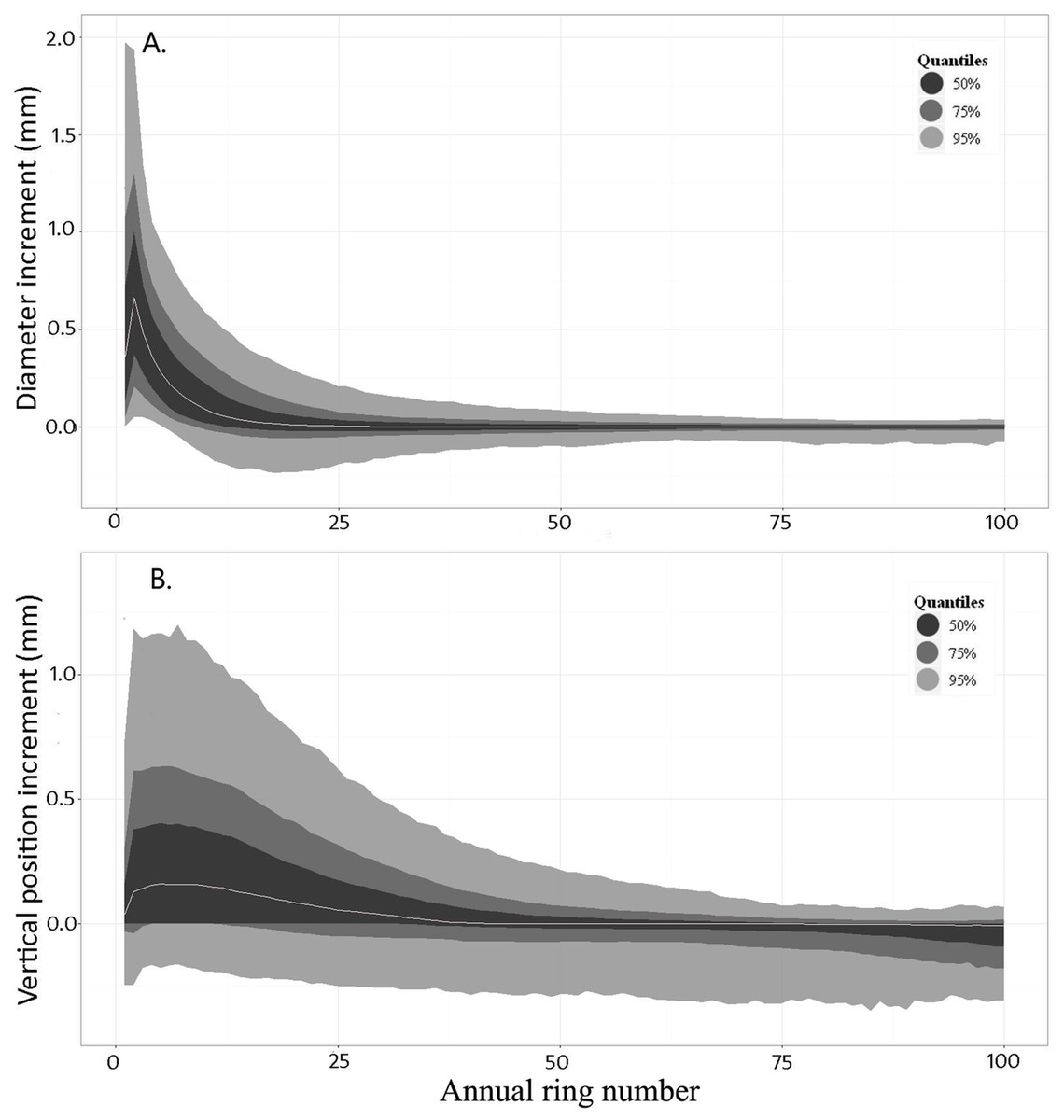The grey line indicates the median of all observations for a given ring number. Contours provide the distribution quantiles around the medianKnot characteristics at time t − 1 were used to make predictions at time t. This ensured a smooth transition between the different sections of the model. After the variable selection process, the general form of the knot diameter model for each section was expressed as: (4) where GUpos,i,j is the relative position of the knot initiation point along the GU (varies from 0 at the base to 1 at the stem apex, and is used to take the phenomenon of acrotony (Powell, 1995) into account), RWi,j,t is the ring width of the stem at the location of the knot in year t, δi and δi,j are the tree- and knot-level random effects and ε is the residual error. All other variables are as previously defined.