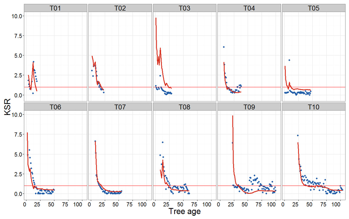 Figure 5: Scatterplots showing the evolution of KSR (total annual knot area increment/stem increment at 1.3 m) with tree age.