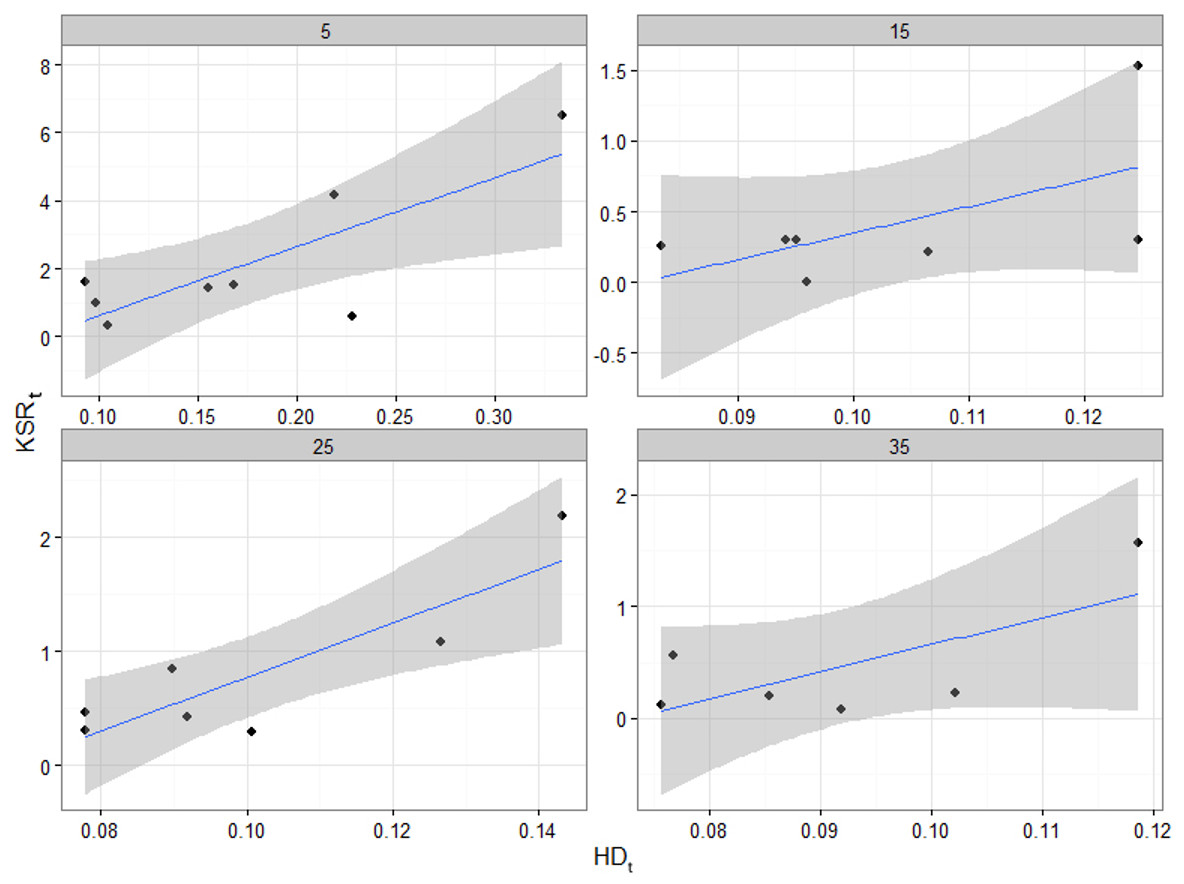 Time series do not start at age 0 because HDt assessments start when the stem has reached a height of 1.3 m. Points, observed values; red lines, model predictions (Eq. (2) and Table 3). Horizontal red line shows an equality between the total annual knot increment and the stem increment at 1.3 m (KSR = 1).Figure 6: Scatterplots of observed KSRt vs. HDt in each sample tree for cambial ages 5, 15, 25 and 35 at breast height.