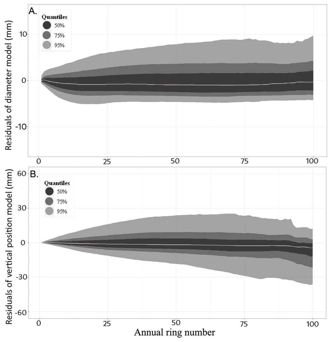 Table 5 shows the fixed effects parameter estimates and associated standard errors for each section of the final model of knot trajectory (Eq. (5)). Again, predictions of knot trajectory profiles were compared to observations in the evaluation dataset. On average, the model was unbiased along the knot profile up to ring 75, with a slight overestimation beyond this point (Fig. 8B). The mean absolute error for this model was 0.118 and the root mean square error (RMSE) 0.189. When the profile of each knot was reconstructed by adding successive annual trajectory predictions, the absolute value of 50% of the residuals was less than 11.9 mm along the entire pith-to-bark profiles, while the absolute value of 90% of the residuals was less than 36.7 mm.