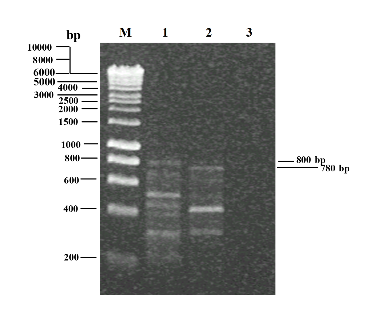 Lane M, molecular size marker; lane 1, amplified product from Macrobrachium carcinus hepatopancreas RNA; lane 2, amplified product from Penaeus vannamei hepatopancreas RNA; lane 3, negative PCR control (amplification without target DNA).