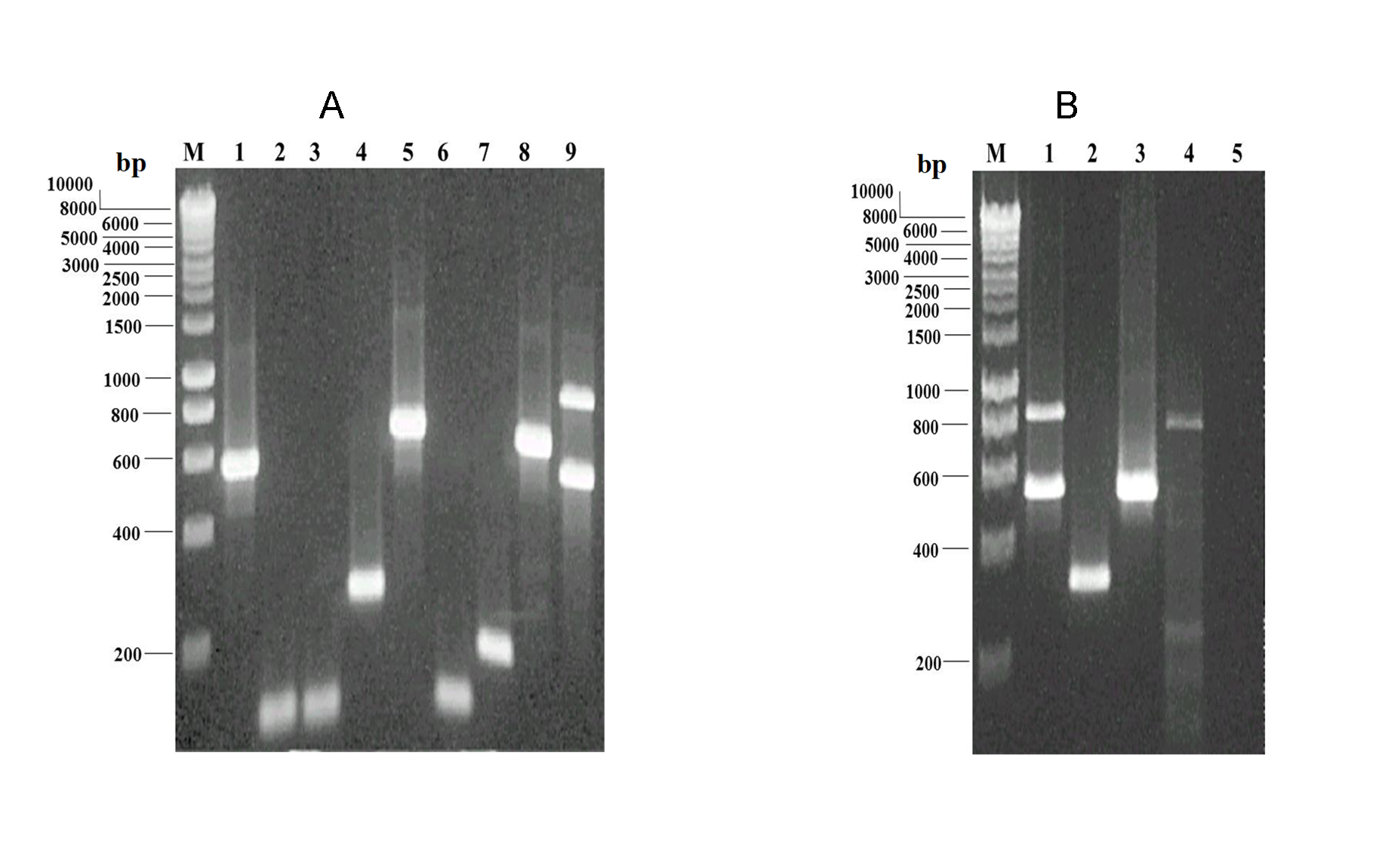 Lanes M, molecular size marker. Gel A, lane 5, negative PCR control; other lanes in both gels, amplified products from several pGEMPig DNAs isolated from different E. coli colonies.