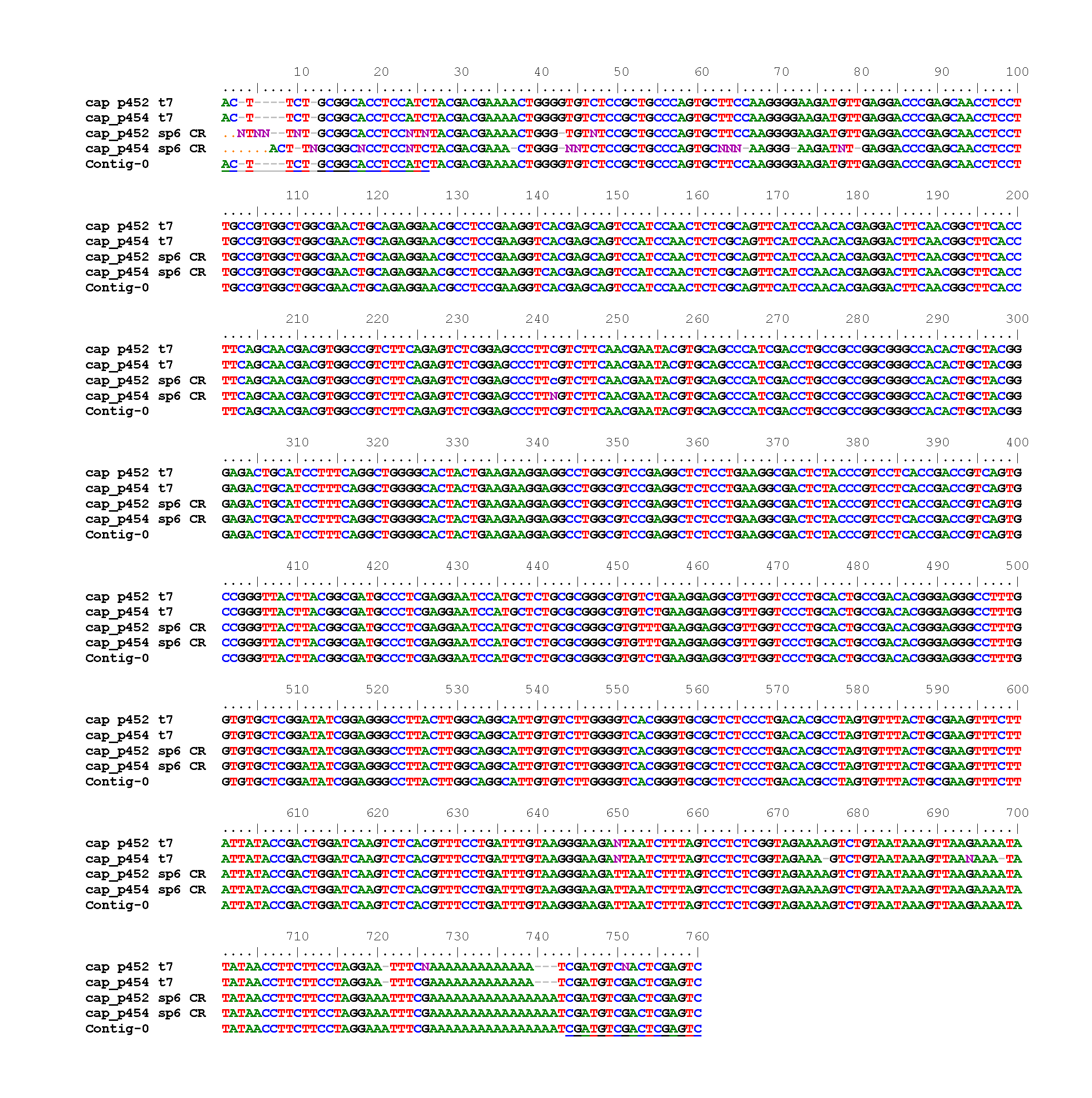 T7 and SP6 sequences from pGEMPig452 and pGEMPig454 plasmids aligned using the Contig Assembly Program module from the BioEdit 7.2.6 program.