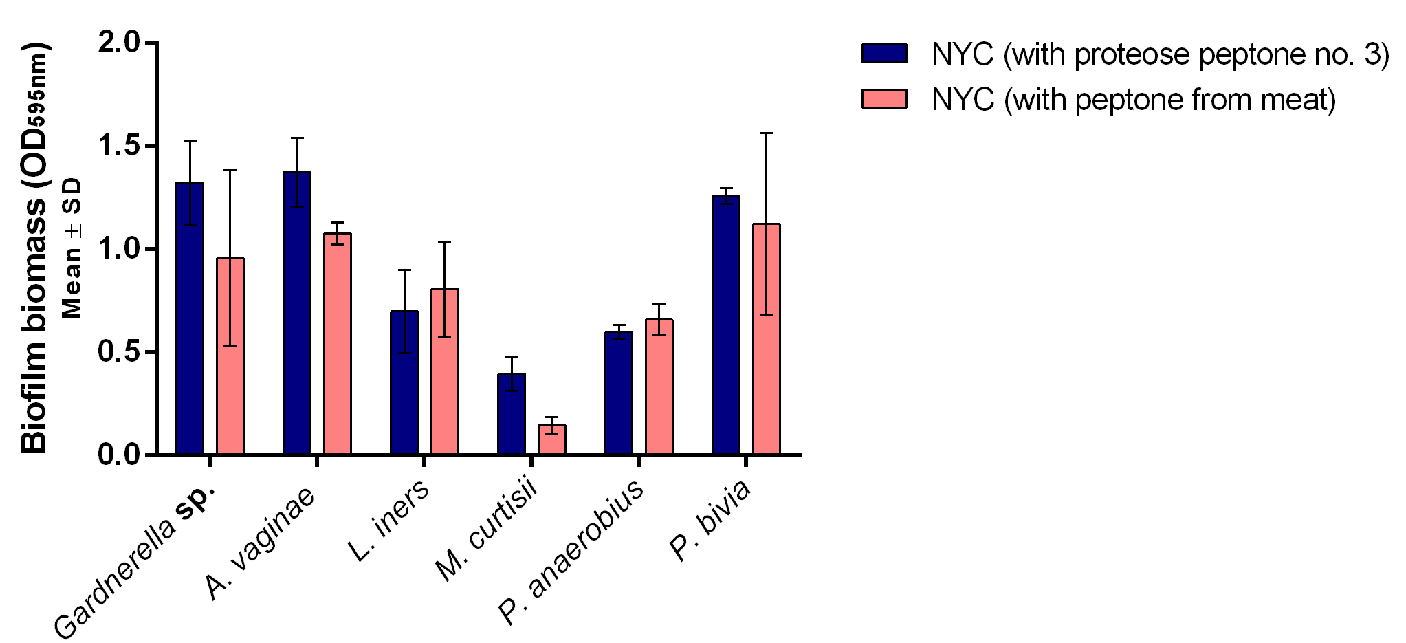 Biofilm formation of BV-associated bacteria in NYC (with proteose peptone no. 3) and altered version of NYC (with peptone from meat) over a 72 h period.