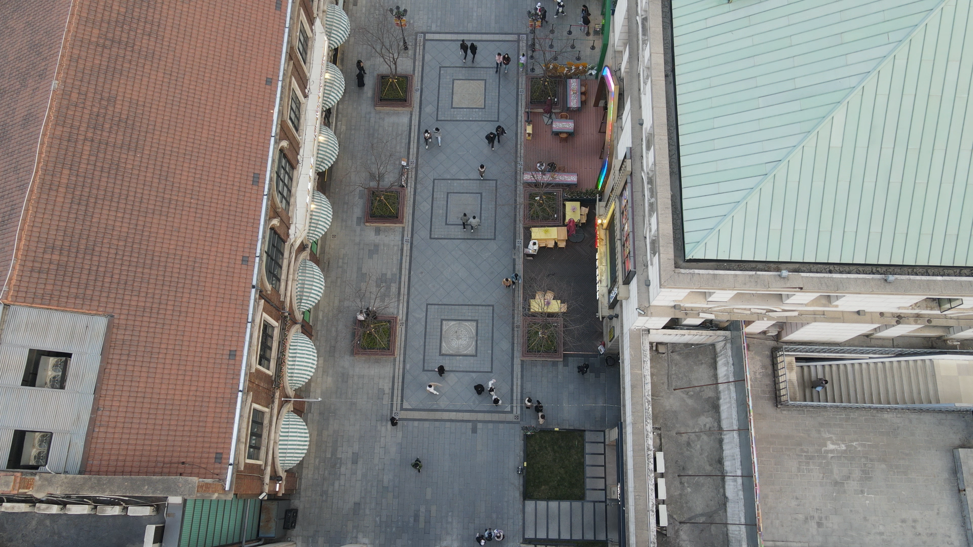 A sunny weekday afternoon (from 3–5 pm) was chosen for the collection of pedestrian data, and an open location at the end of the street was selected for take-off. When the drone had reached the optimal flight altitude, we rotated the drone lens through 90° and adjusted it to an overhead view angle, always flying forward along the direction of the street, as shown in Fig. 3. During the flight, the drone maintained a selected constant speed, and the white balance and ISO were kept automatic. In addition, considering that the UAV needs to change batteries midway to maintain flight, the data are collected in segments according to the functional partition of the study area and stored in MP4 mode with the resolution set to 1,920 × 1,080 p.