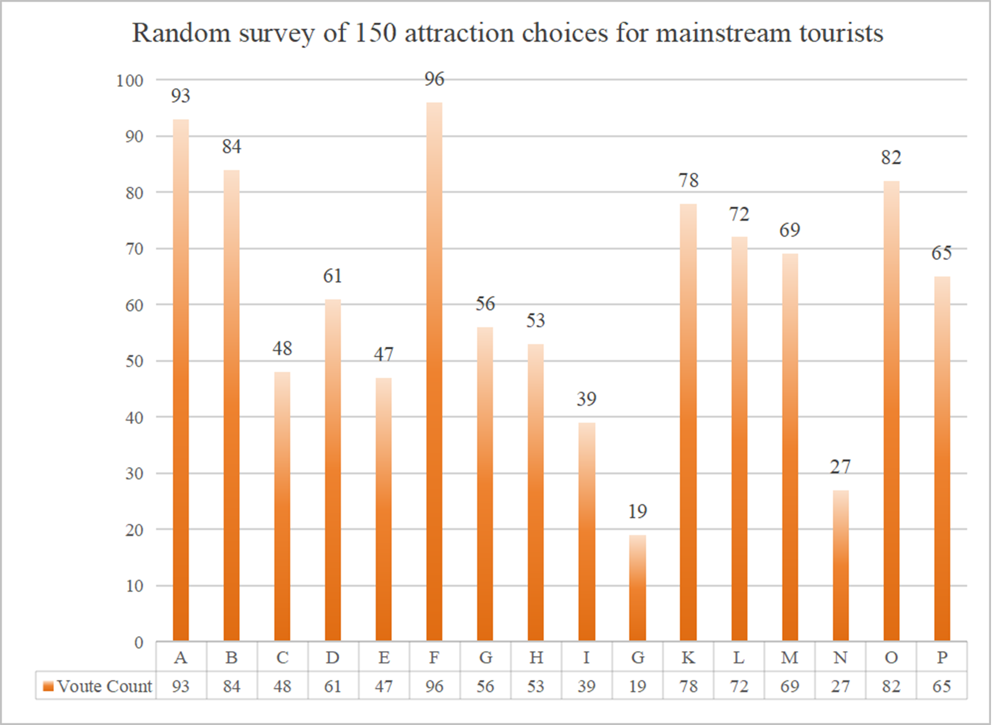 First, we look for 30 tourists, each with corresponding traveling days and vote for the following five mainstream routes and six routes obtained from the model. The routes and statistical results are as follows (D is the model route):