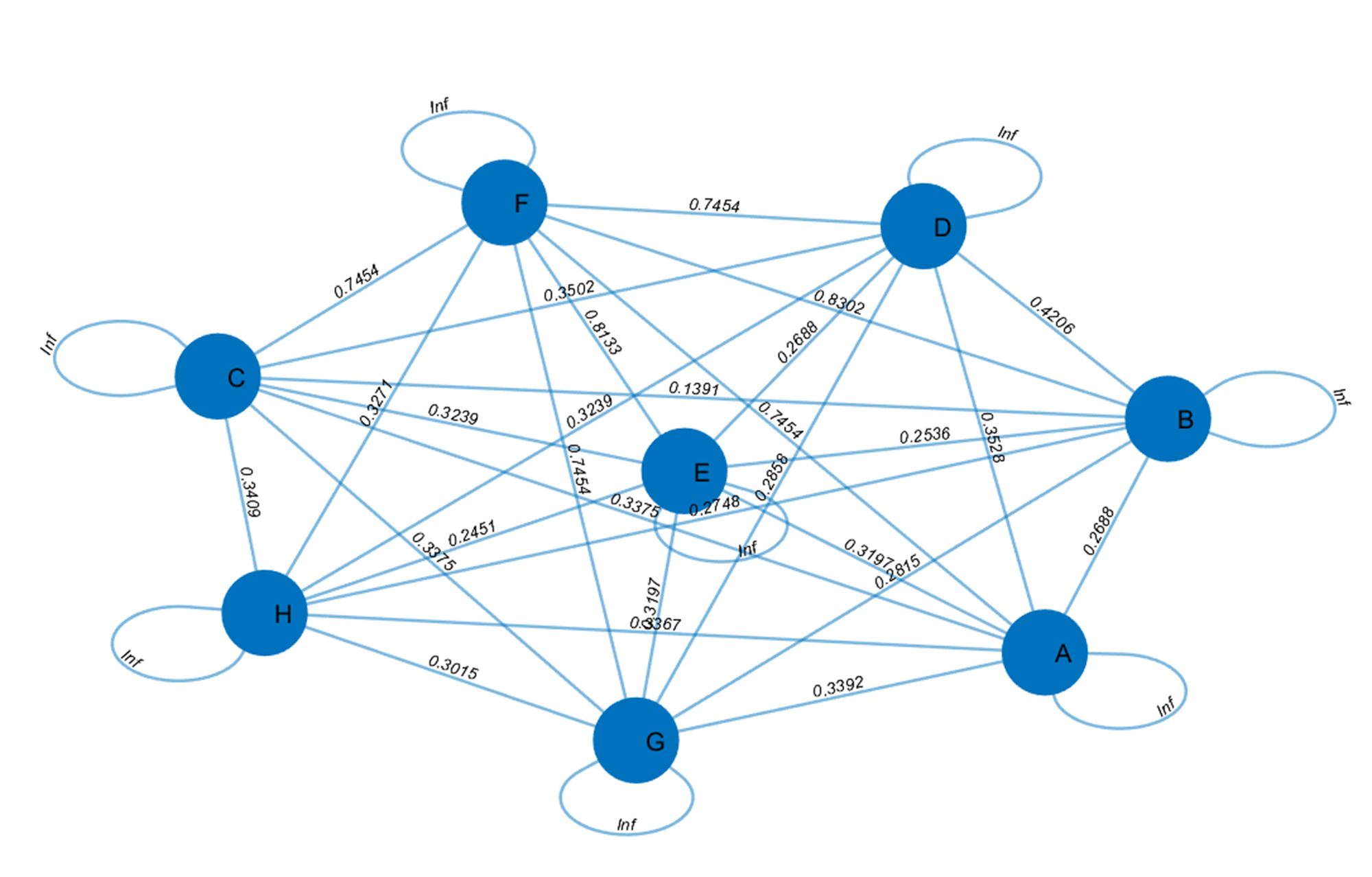 We divided the congestion as follows: 5 (High), 4 (Moderately High), 3 (Medium), 2 (Medium-Low), 1 (Low). Data on the distance and congestion between the eight recommended attractions has been collected. In this analysis, the weights assigned were 0.1852 for distance and 0.1468 for congestion. The path scoring table can be obtained and make the undirected graph shown in Fig. S4.