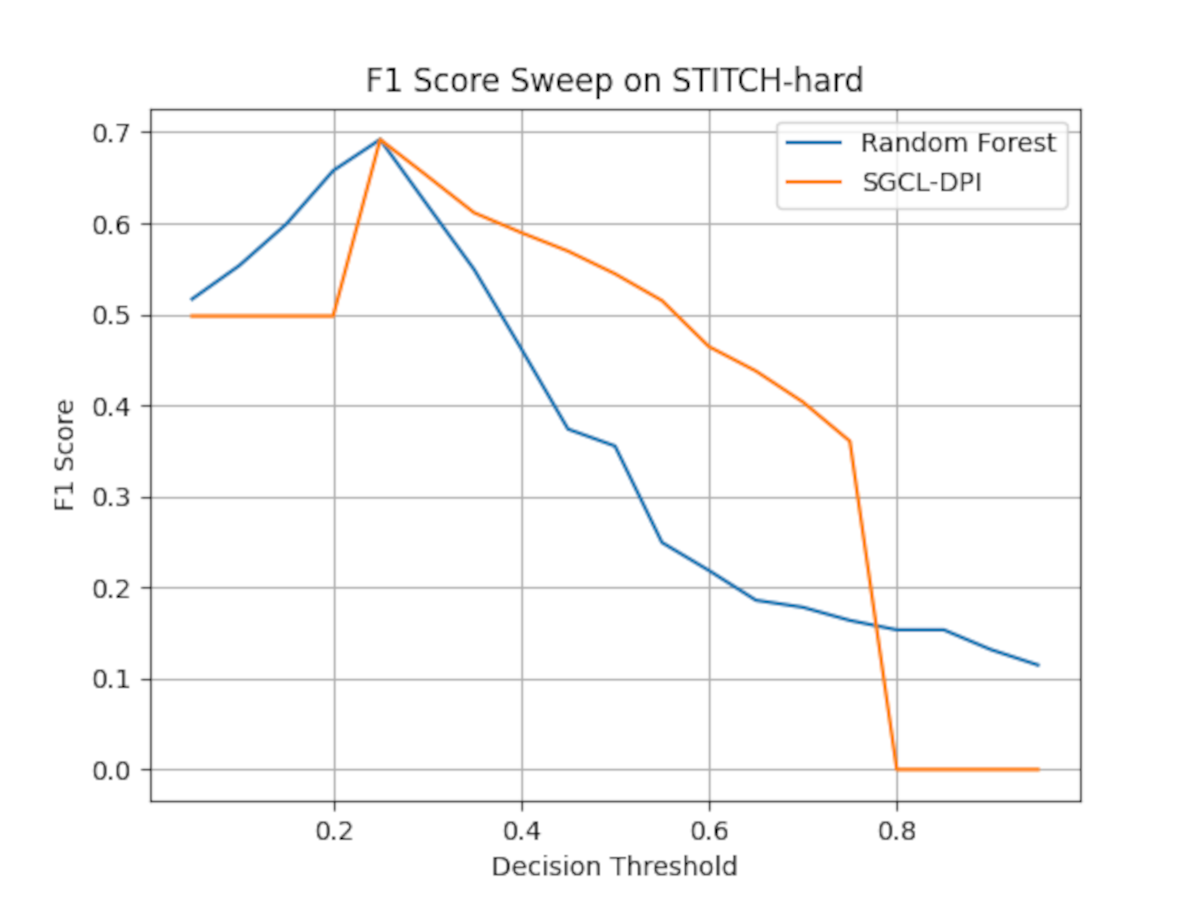 The Random Forest baseline (blue) and SGCL-DPI (orange) are evaluated by varying the classification threshold from 0.05 to 0.95. Both models achieve peak F1 performance at a threshold around 0.25, with SGCL-DPI maintaining superior stability and higher scores at moderate thresholds, while Random Forest performance degrades more rapidly as the threshold increases.