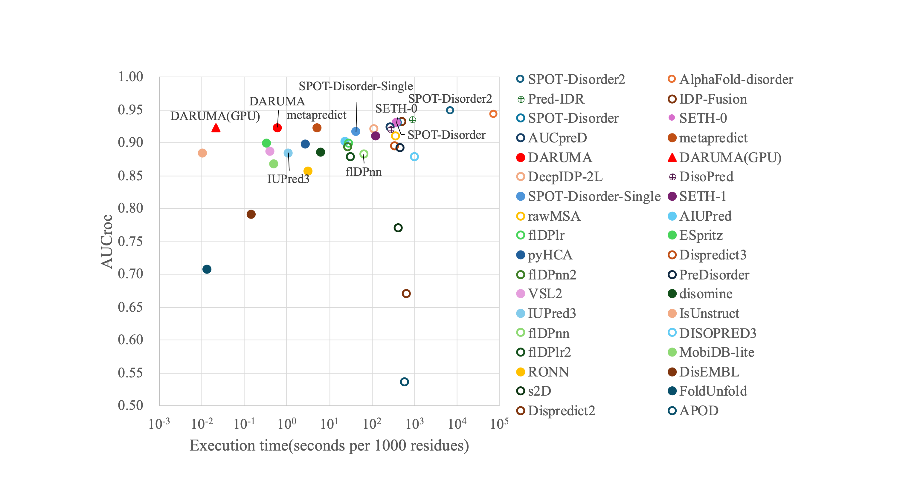 Although we used eight predictors as reference predictors in the development of the DARUMA model, we compared the performance of DARUMA with 34 predictors available from CAID2 (https://caid.idpcentral.org/challenge/results) (Table S3). In order to ensure a fair comparison of execution time, we ran DARUMA on the Intel Xeon E5-2697 v4 processor at 2.30 GHz with RAM limited to 47 GB, which matches the RAM size used in the CAID2. Some profile-free predictors, such as SETH-0, metapredict, and DARUMA, show comparable performance, although the predictors demonstrating high performance were mostly profile-driven ones. DARUMA achieved high speed prediction than other two among these three. Figure S2 showed that DARUMA is a well-balanced IDR predictor in terms of both prediction accuracy and execution time.