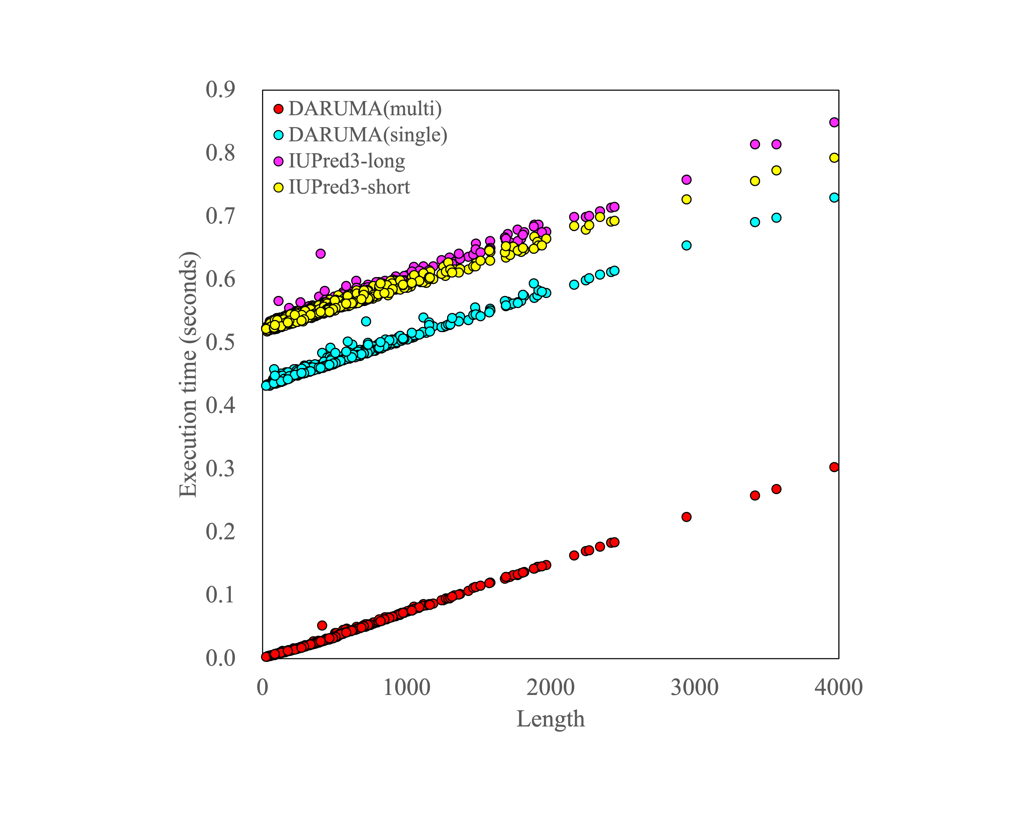 The circles represent the execution times of proteins for DARUMA(multi) (red circles), DARUMA(single) (cyan circles), IUPred3-long (magenta circles), and IUPred3-short (yellow circles), respectively.