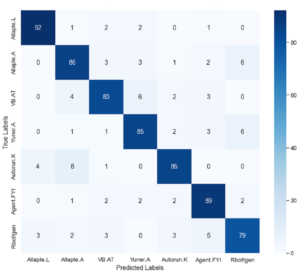 We utilized the Malimg and MaleVis datasets to assess the performance of our model. For our testing scenario, we employed three classes from the Malimg dataset, encompassing seven families. The experiments were conducted using all instances per class. However, for visualization purposes, we presented a confusion matrix using a stratified subset of approximately 100 samples per class. This was done to maintain visual clarity and balance across classes, especially considering the significant class imbalance in the original dataset (e.g., Allaple.A with 2,949 samples vs. Autorun.K with only 106). This does not affect the reported performance metrics, which are computed over the full test set.