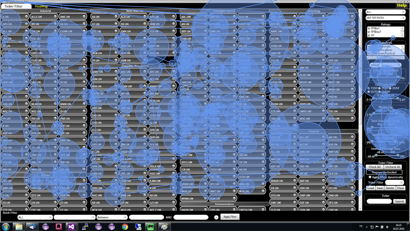 At the core of the visual structure is a squarified treemap layout algorithm, chosen for its ability to maintain low aspect ratios and preserve visual comparability between nodes. Each treemap node represents a financial entity, such as a company, sector, or instrument, and the hierarchical structure reflects domain taxonomies (e.g., “sector → rating class → firm”). The layout maintains spatial consistency over time, enabling users to develop spatial memory and quickly return to familiar regions of interest.