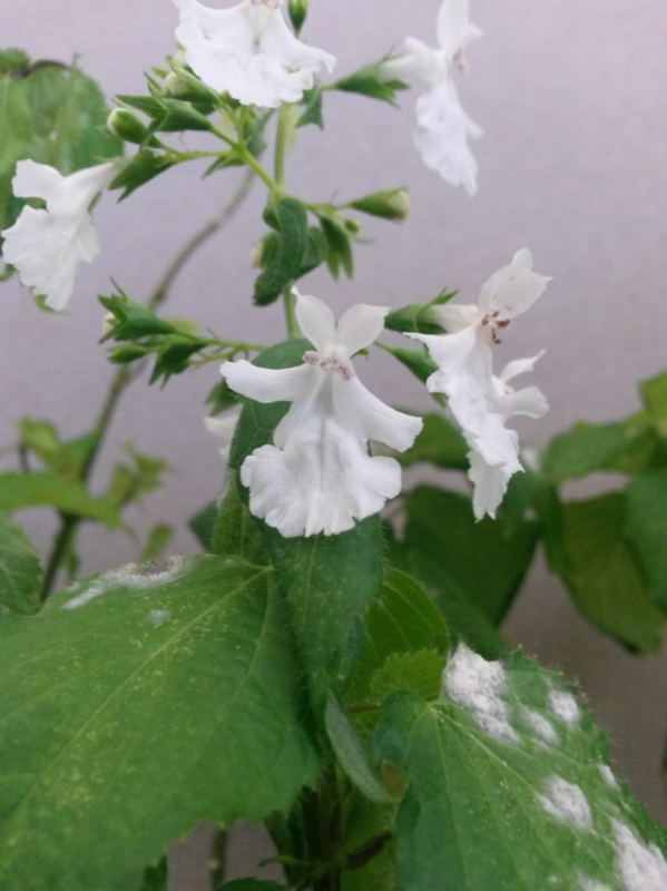 Phyllostegia kaalaensis in bloom in a growth chamber. White patches are the fungal pathogen, Neoerysiphe galeopsidis