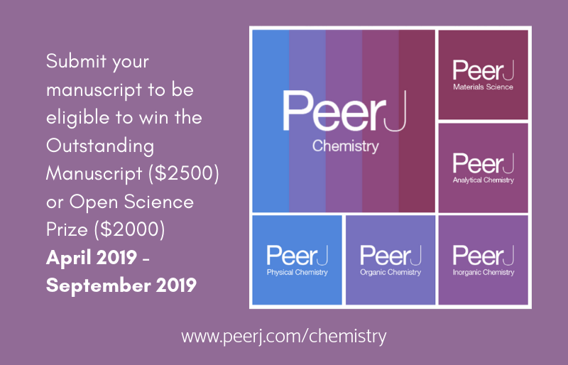 The PeerJ Chemistry Outstanding Manuscript Award and the PeerJ Chemistry ECR Open Science Award are open to all applicants who submit either a manuscript or preprint to one of the five new PeerJ Chemistry journals: PeerJ Physical Chemistry, PeerJ Organic Chemistry, PeerJ Inorganic Chemistry, PeerJ Analytical Chemistry, and PeerJ Materials Science.