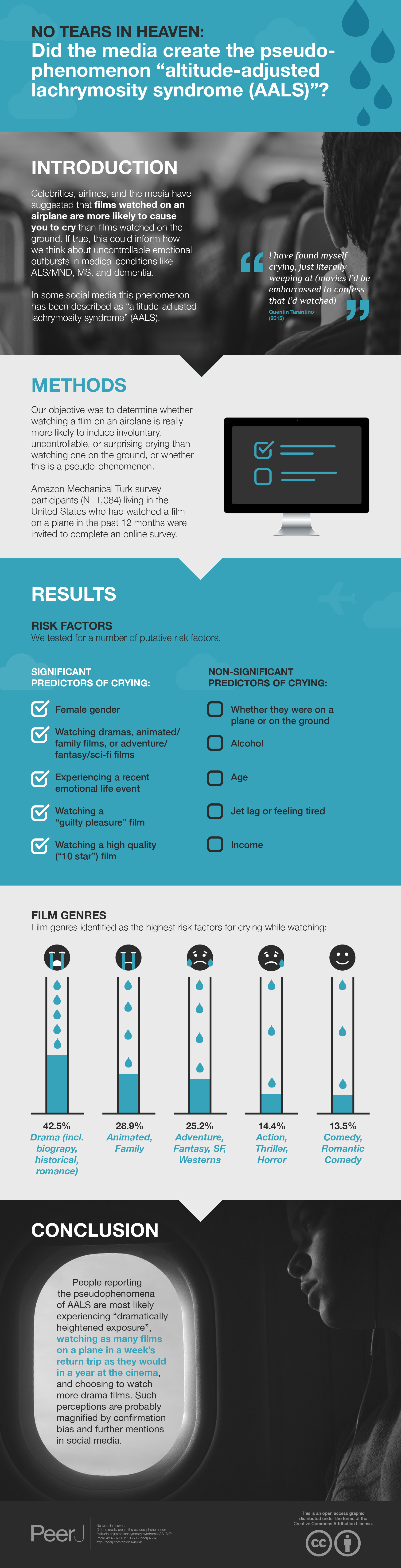 This study had a number of limitations that may compromise validity such as selection bias, recall bias, the heterogeneity of viewing experiences in the air (e.g., long-haul vacation with children in economy vs. traveling alone for work in business class) as well as on the ground (e.g., watching a rerun on television vs. going to the cinema to watch a new release). Researchers have cautioned that results from mTurk may not generalize to the US population, and we found our respondents were more likely to be male, younger, and wealthier than average citizens (Mortensen & Hughes, 2018) Seasonality was not controlled for, which would have allowed us to discount seasonal affective disorder; however data was gathered in the summer and most cinema viewings appeared to be recent releases. We did not gather information on which scenes prompted crying or whether it was the first time a participant had watched this film. We did not screen participants for psychiatric disorders with a validated measure, which could have improved confidence that mood disorders were not a significant factor. We did not ask participants if they were taking any medication, which may have been a factor.
