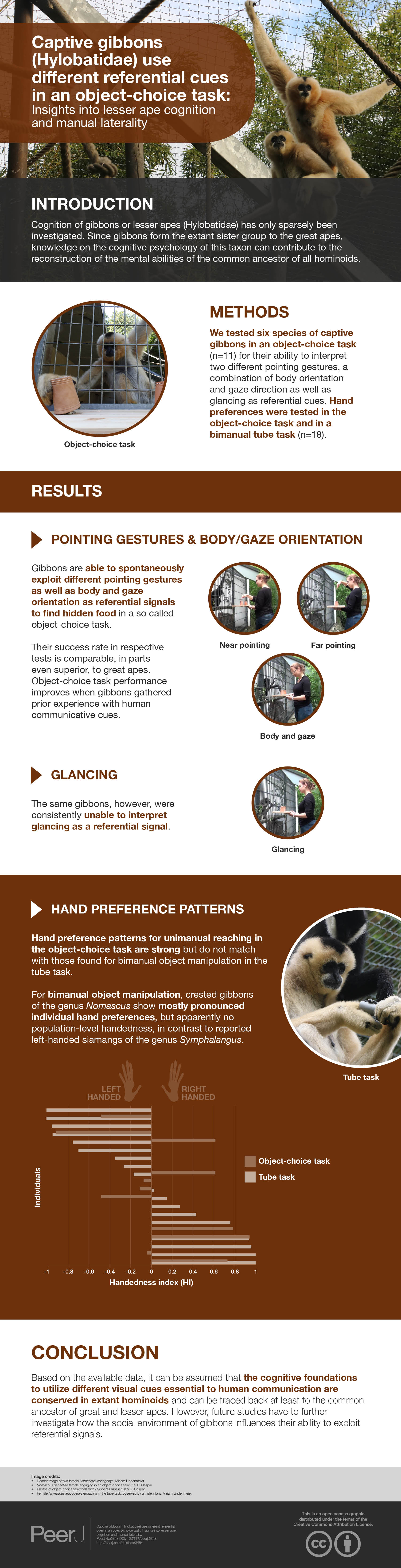 - 2018. Captive gibbons (Hylobatidae) use different referential cues in an object-choice task: insights into lesser ape cognition and manual laterality. PeerJ 6:e5348 https://doi.org/10.7717/peerj.5348