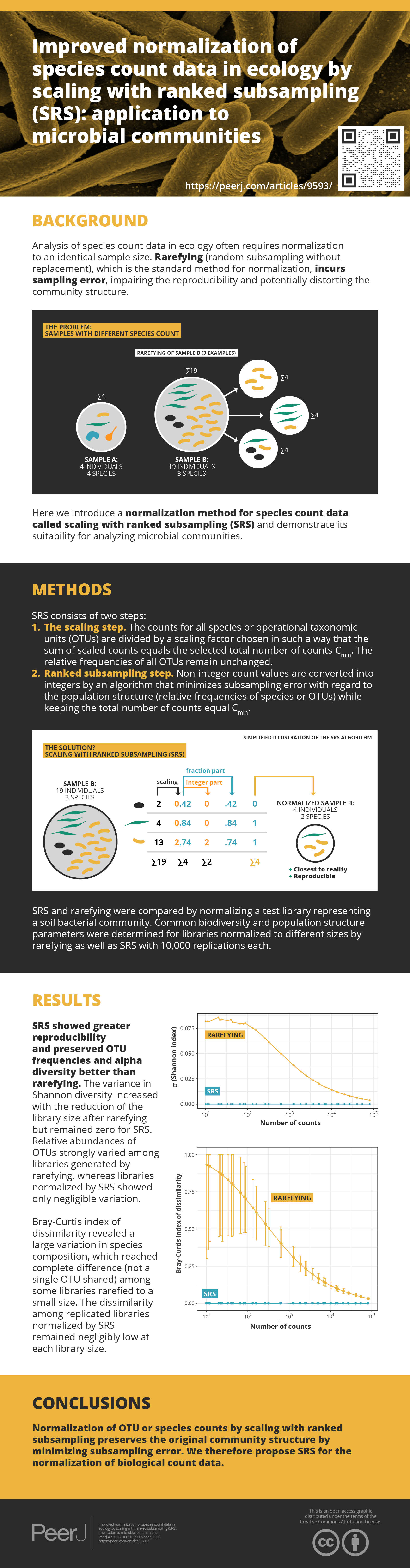 - 2020. Improved normalization of species count data in ecology by scaling with ranked subsampling (SRS): application to microbial communities. PeerJ 8:e9593 https://doi.org/10.7717/peerj.9593