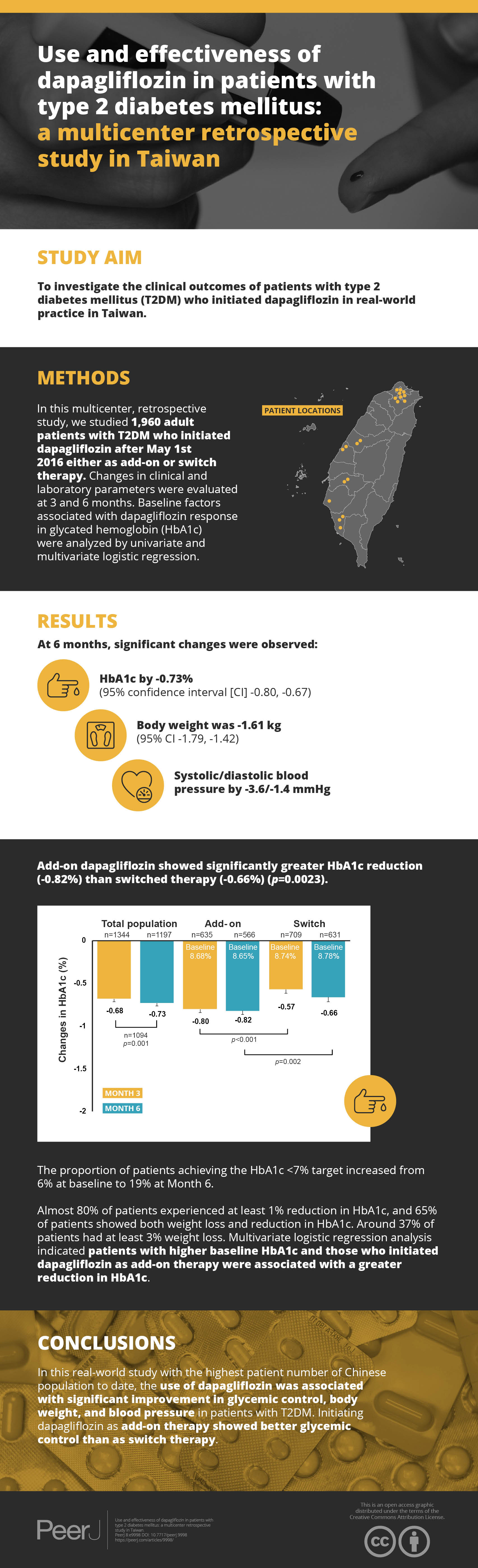 - 2020. Use and effectiveness of dapagliflozin in patients with type 2 diabetes mellitus: a multicenter retrospective study in Taiwan. PeerJ 8:e9998 https://doi.org/10.7717/peerj.9998